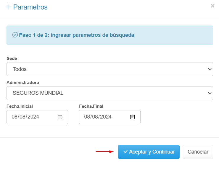 2. Diligencia parámetros requeridos y haz clic en el botón Aceptar y Continuar.