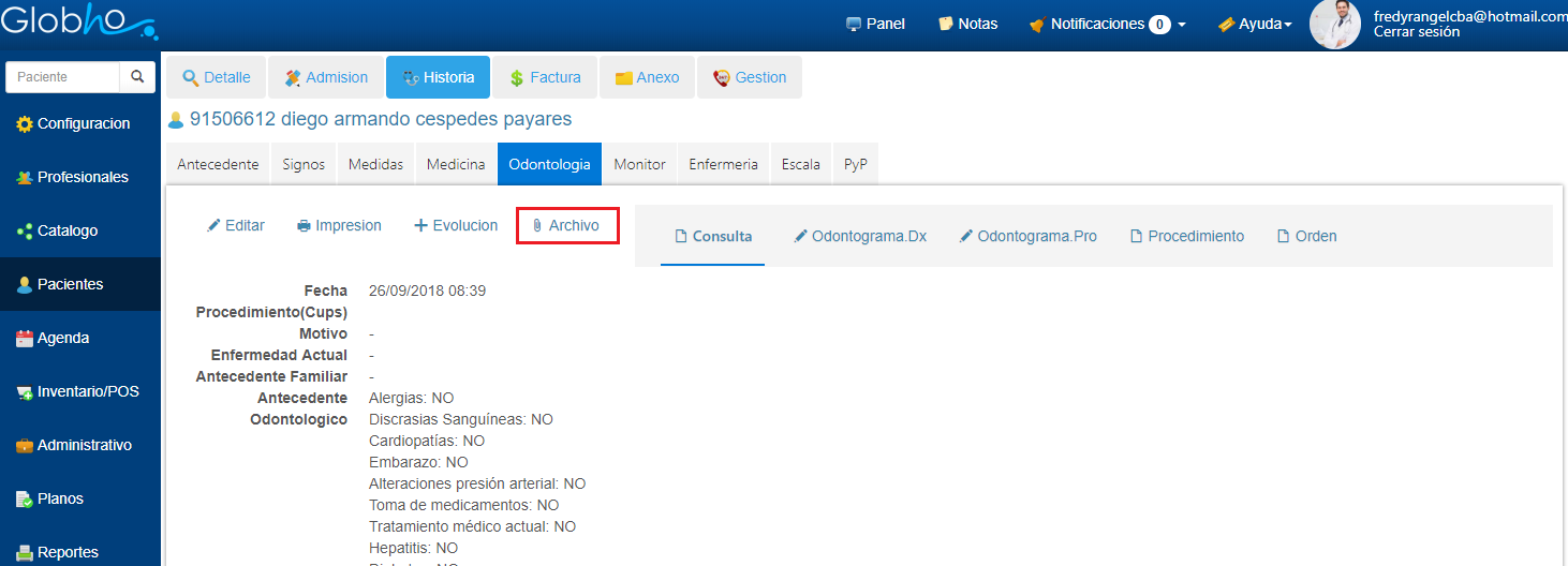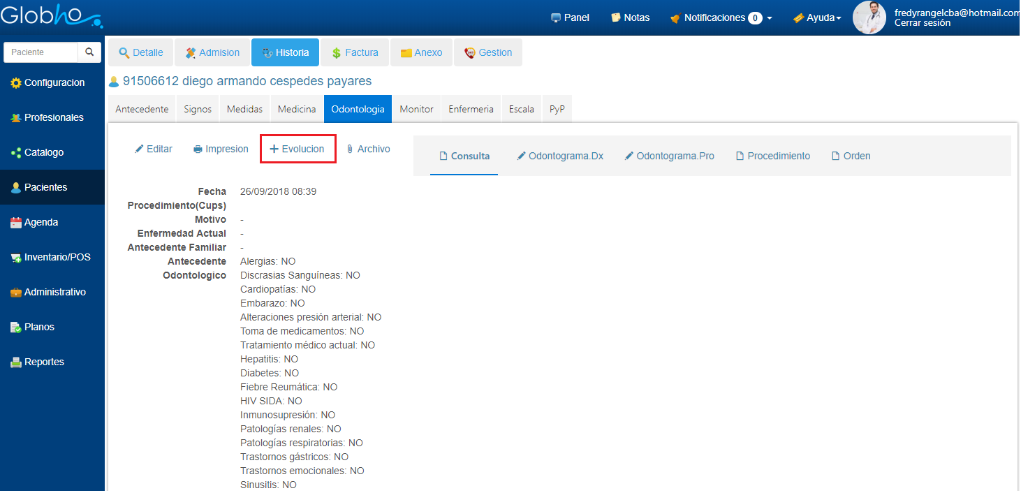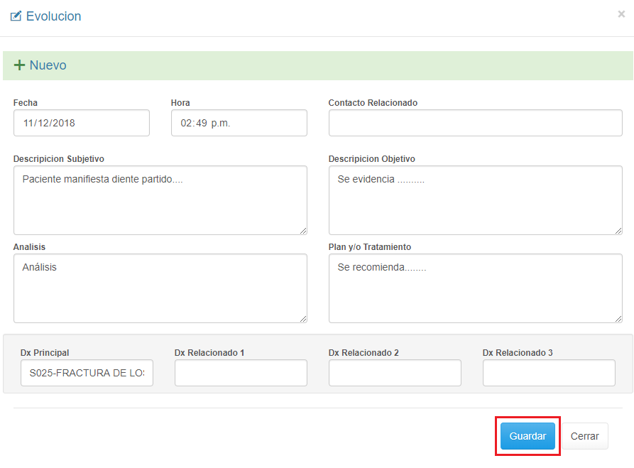 Una vez guardada la Consulta, puedes realizar registro de Evolución, adjuntar Archivos e Imprimir.. Registro de Evolución 1. En el detalle de la Consulta, haz clic sobre el botón Evolución.