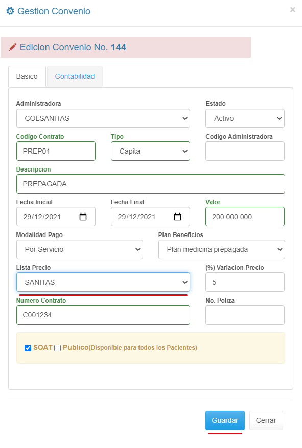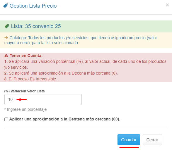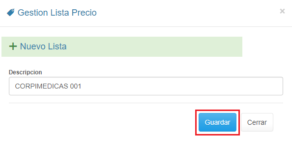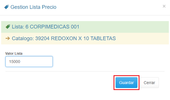 5. Ingresa el valor de la Lista de Precios y haz clic en el botón Guardar.