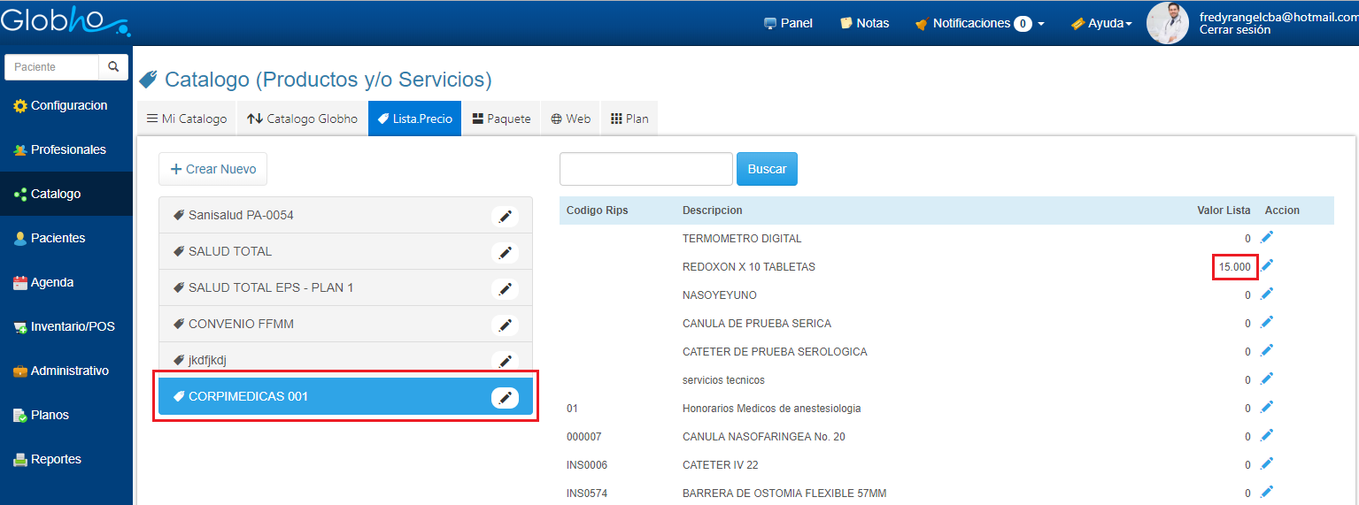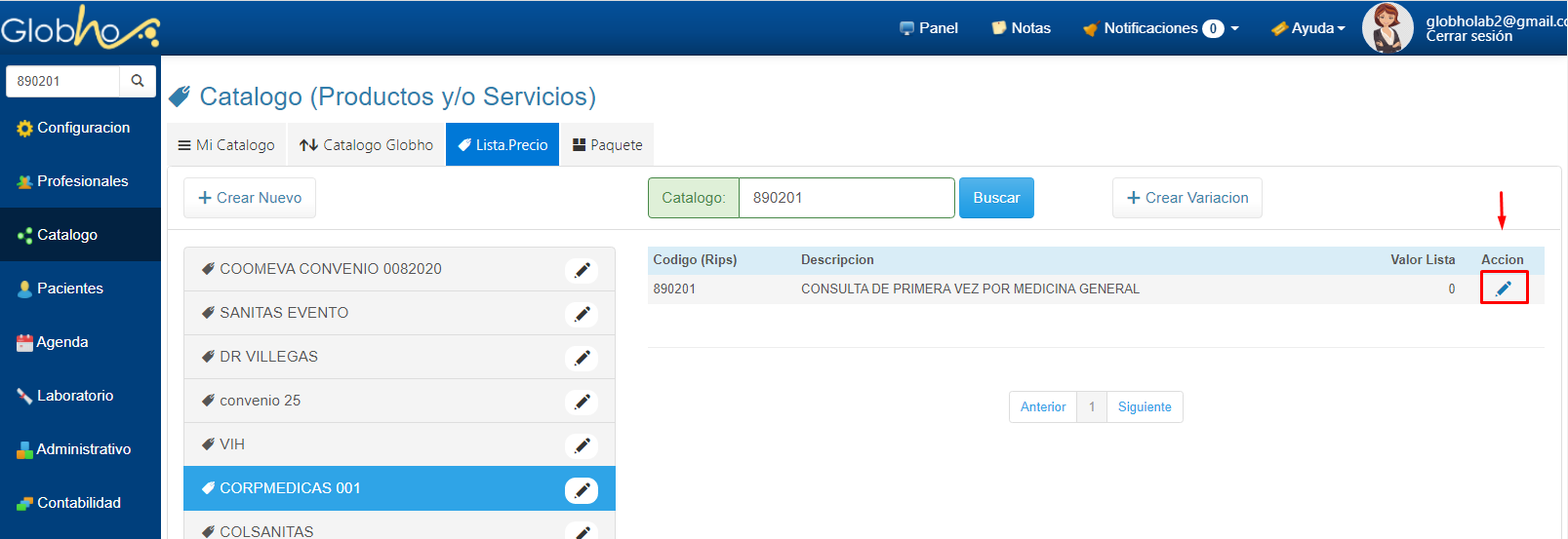 5. Una vez filtrado el item, haz clic en el icono en forma de lápiz ubicado en la columna acción para asignar Precio.