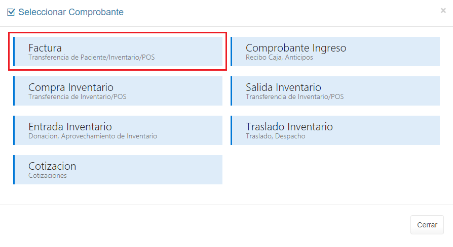 1. Selecciona Inventario/POS en el Menú Principal. 2. Haz clic en Movimiento (Factura o Cotización) y selecciona el Comprobante que deseas realizar.