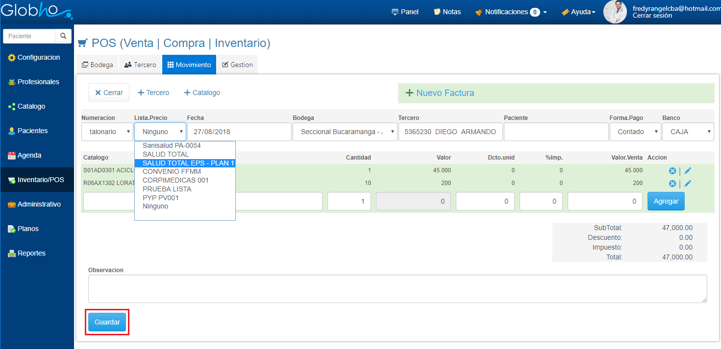 3. En el campo Lista.Precio, selecciona la lista que vas a asignar, diligencia los demás datos de la Factura (Ver aqui). Haz clic en el botón Guardar.