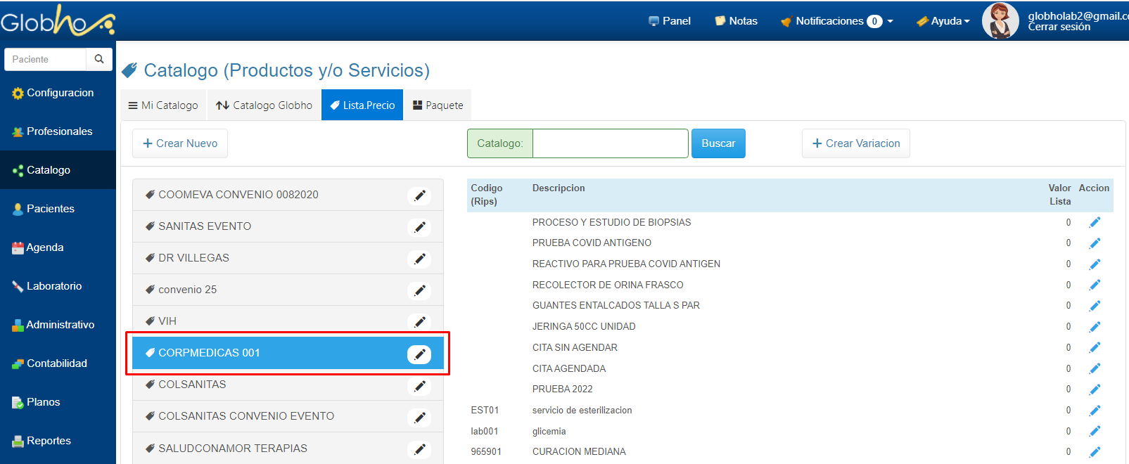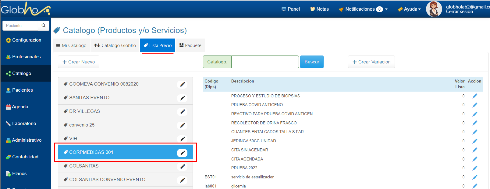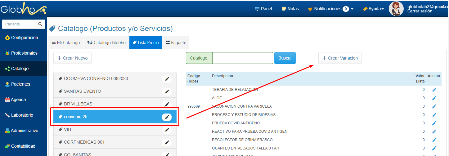 1. Selecciona Catálogo en el Menú Principal y Haz clic en la sección Lista.Precio. 2. Haz clic sobre el botón + Crear Variación