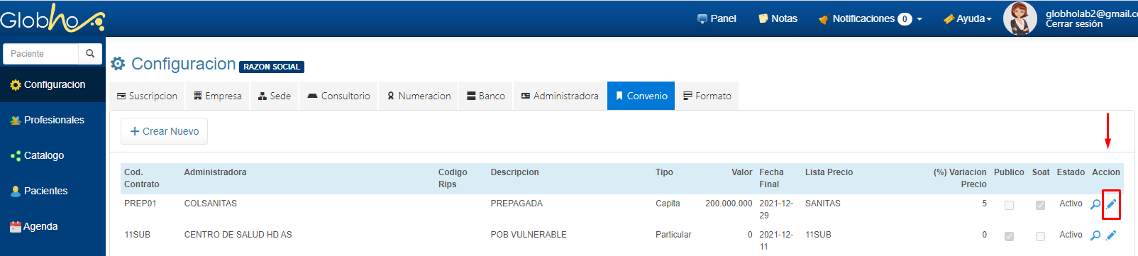2. Haz clic en el icono en forma de lápiz, ubicado en la columna acción correspondiente al Convenio al cuál debes asignar la Lista Precio.