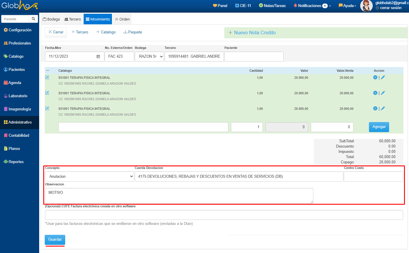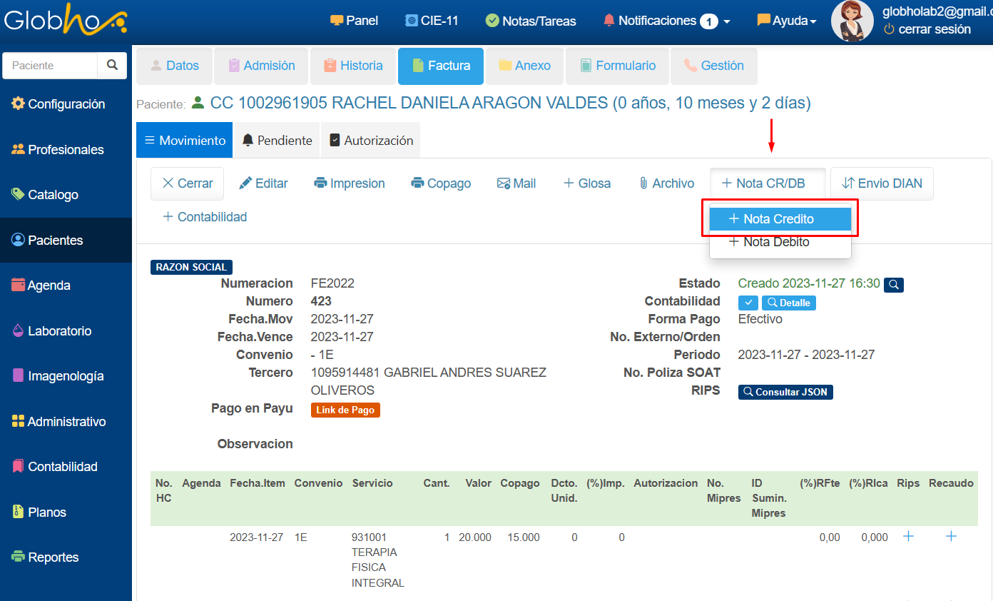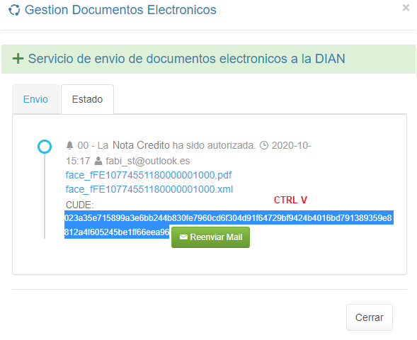 1. En el Detalle de la Nota Crédito haz clic en el botón ENVIO DIAN