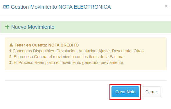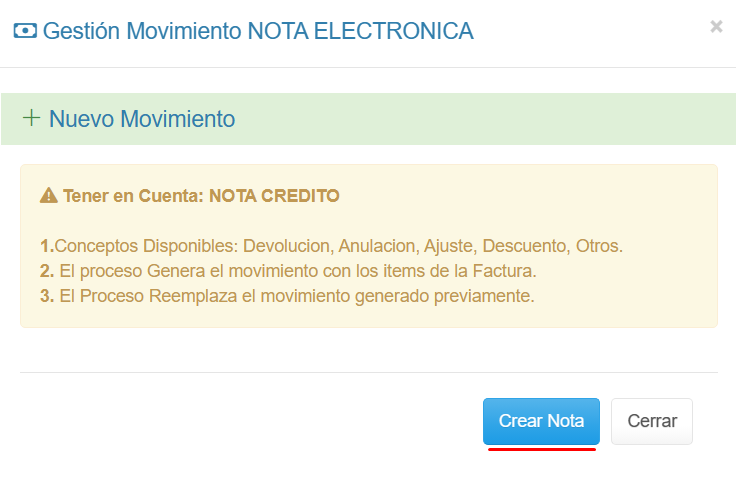 1. En el Detalle de la Factura previa haz clic en el botón + Nota CR/DB y selecciona la opción + Nota Crédito.