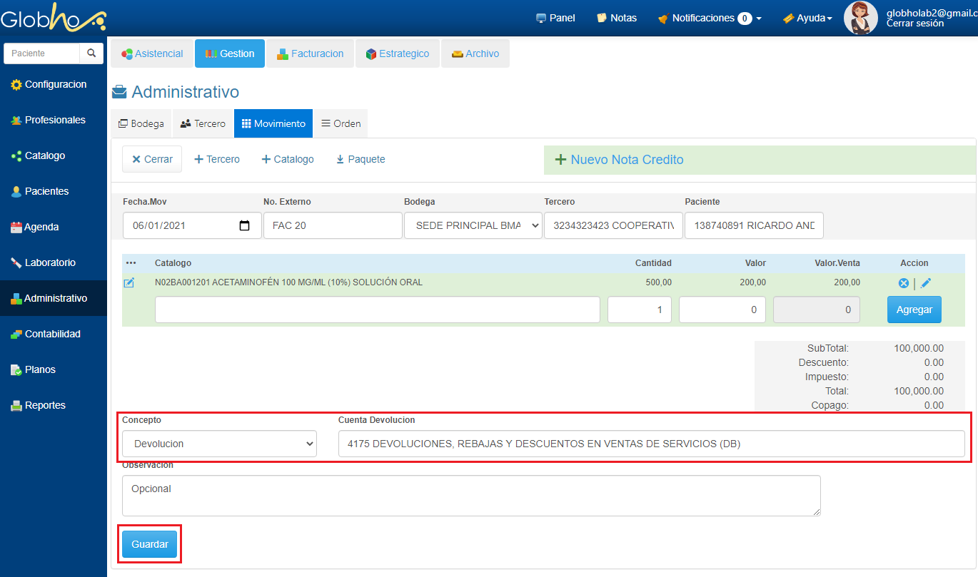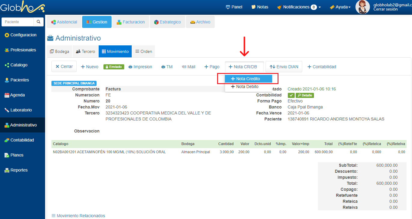 Nota: Para la guía práctica realizamos una nota crédito por concepto de Devolución. Ejemplo: La empresa Cooperativa médica del Valle y Profesionales de Colombia realiza la devolución de 500 unidades vencidas de acetaminofén facturadas por la empresa A prueba. |