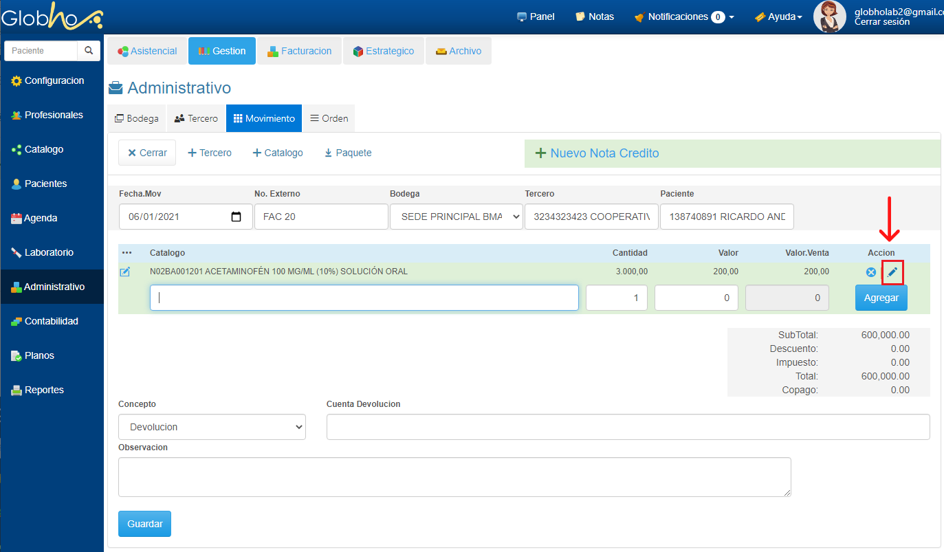 3. Haz clic en el icono en forma de lápiz al final del registro del item que deseas modificar para hacer la Devolución.