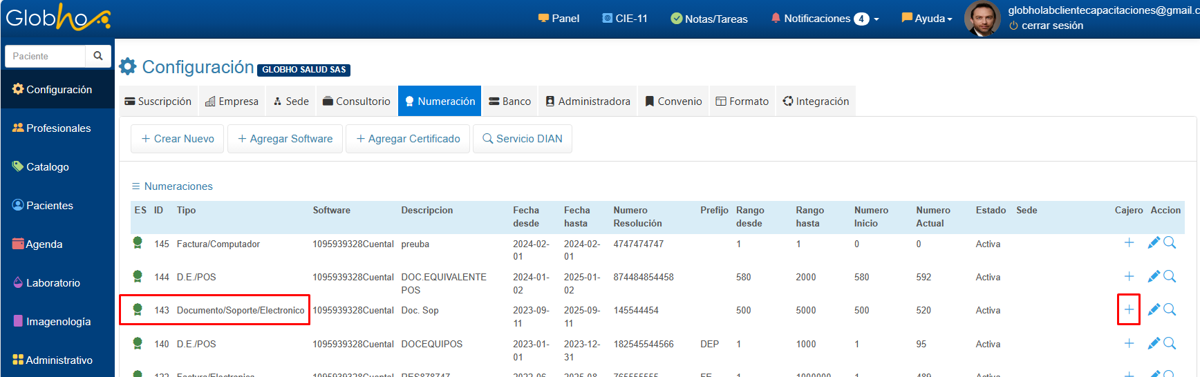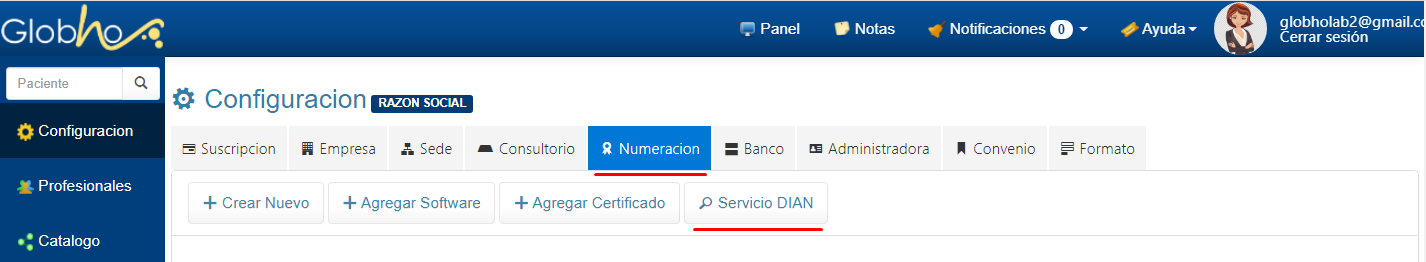 1. Ingresa a Menú Configuración, selecciona la opción Numeración y haz clic en el botón Lupa Servicio DIAN. para consultar los datos autorizados en la Resolución.