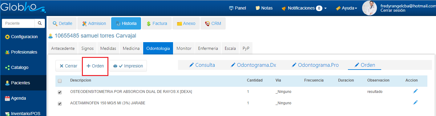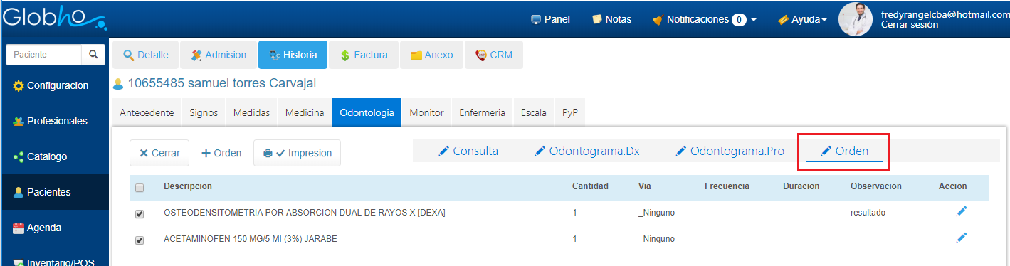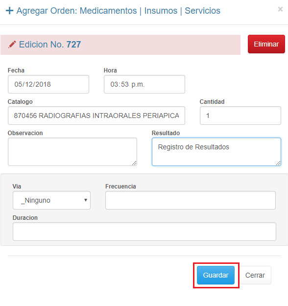 Para el caso de las Ordenes de Ayudas Diagnosticas, haz clic en el icono en forma de Lápiz correspondiente e ingresa los resultados en el campo Resultado. Para finalizar haz clic en el botón Guardar.