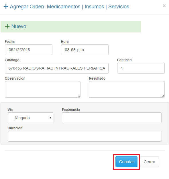 4. Agrega el item (Ayuda Dx, Consultas, Medicamentos o Procedimiento Terapeutico) y haz clic en el botón Guardar.