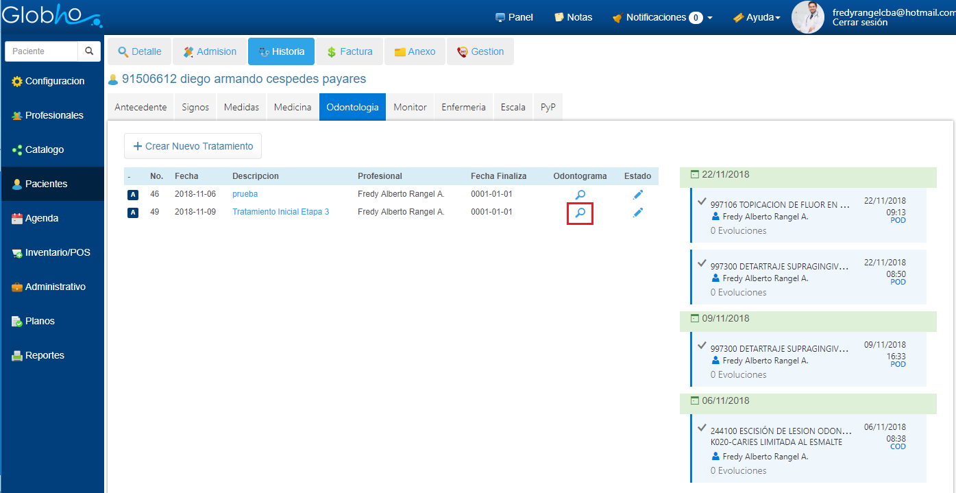 1. Ingresa al Detalle del Tratamiento, haciendo clic en el icono en forma de Lupa al final del registro.