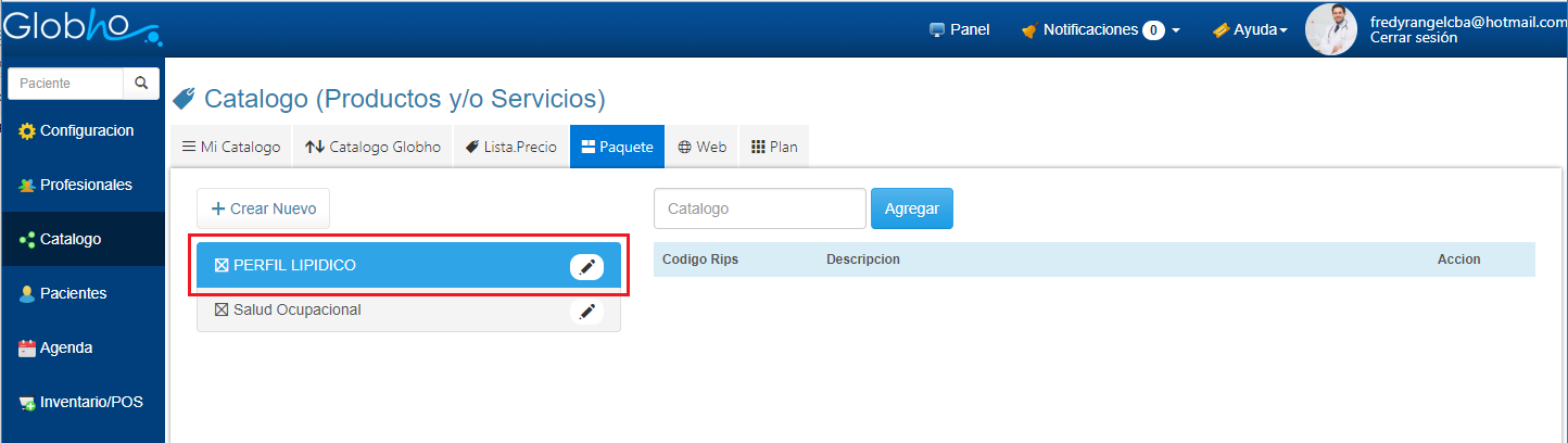 1. Ingresa a Catálogo y haz clic en la pestaña Paquete. 2. Haz clic sobre el Paquete al cuál vas a agregar los Servicios.