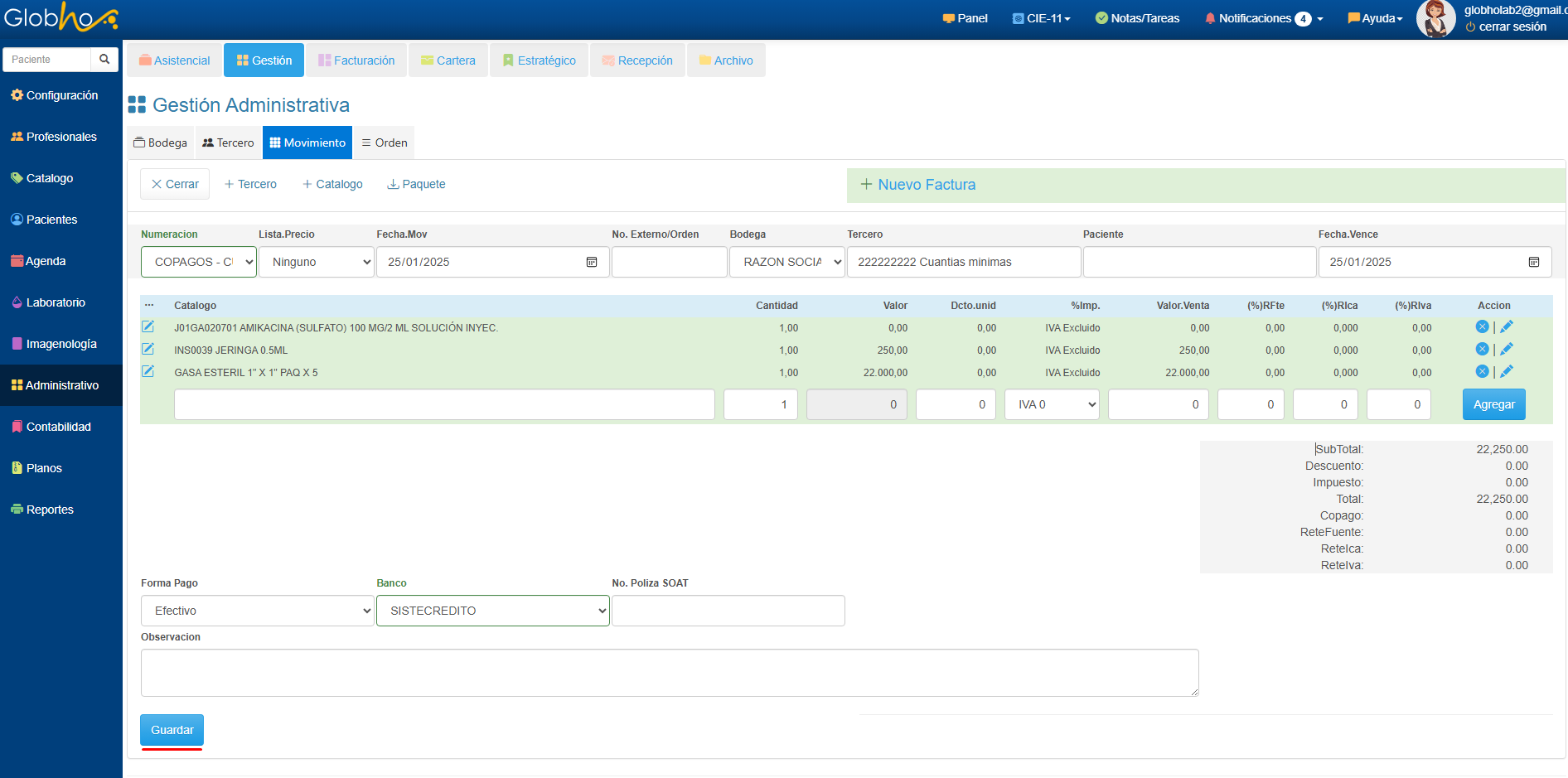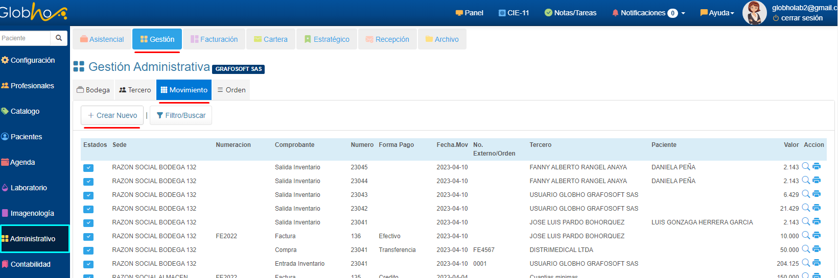 1. Ingresa a Administrativo en el Menú Principal. y en la ruta Gestión - Movimiento, haz clic en el botón Crear Nuevo.