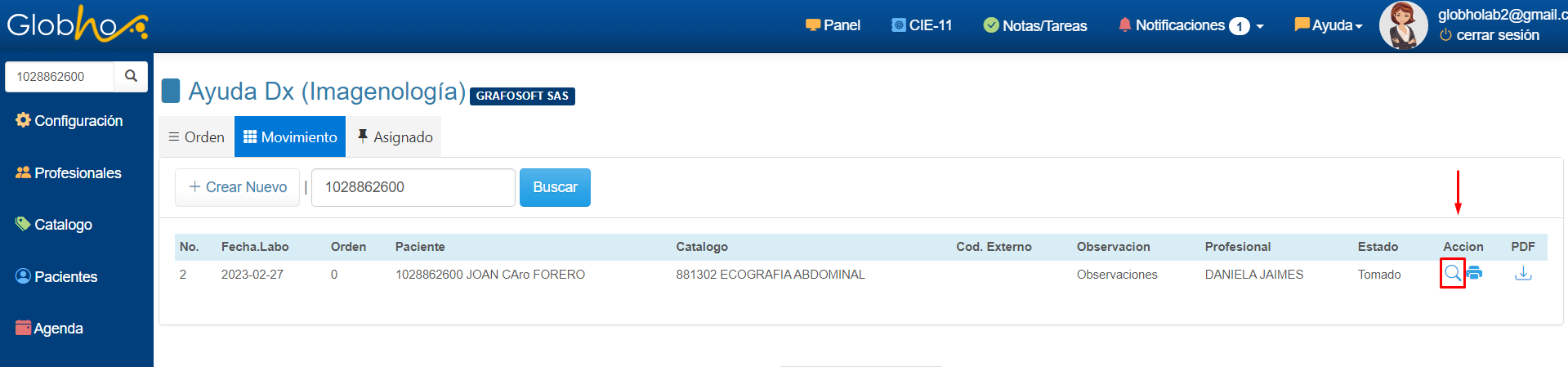 11. Realiza la ruta menú principal, Imagenología/movimiento, digita número de documento del paciente y haz clic en el botón Buscar.
