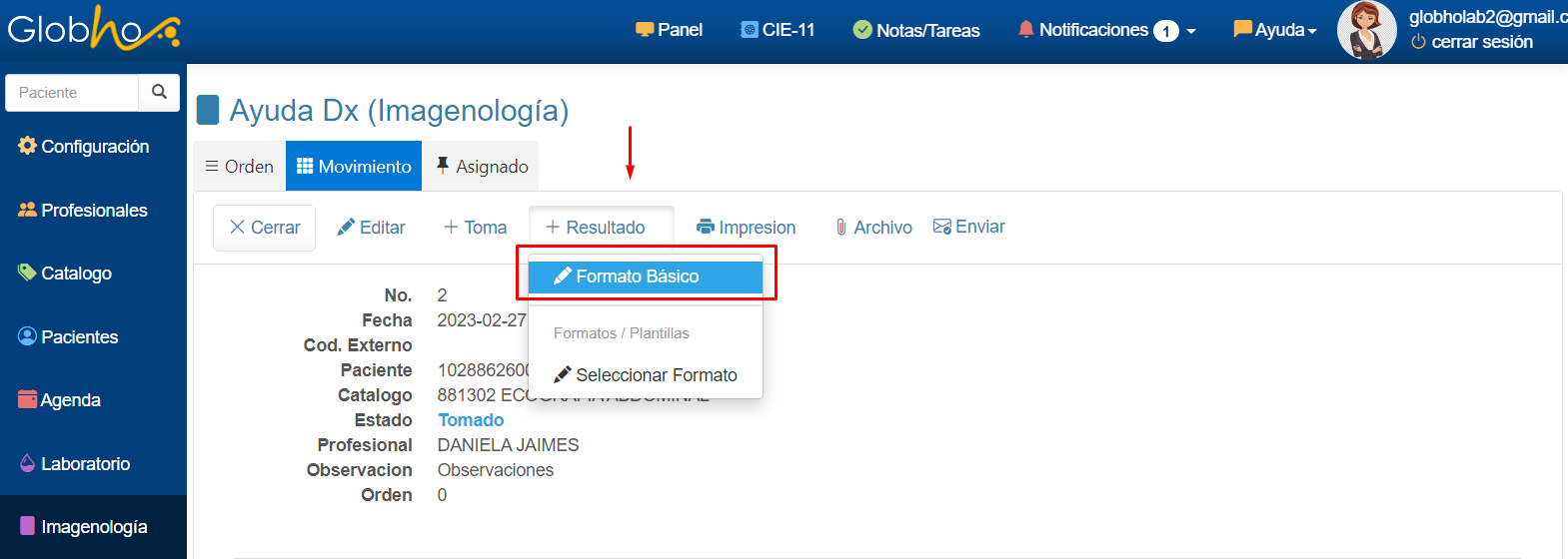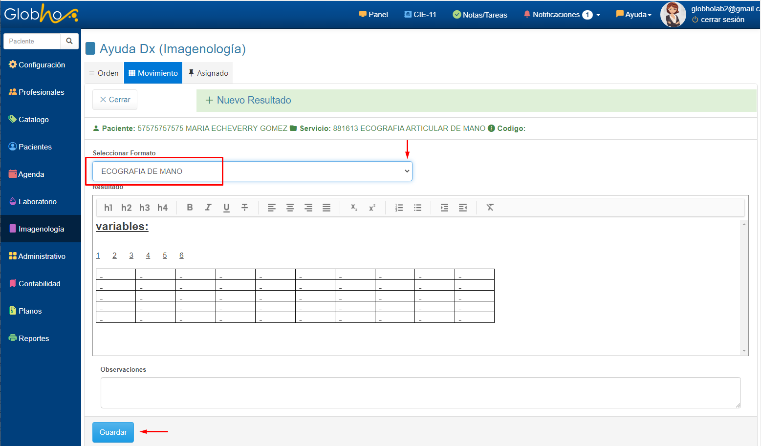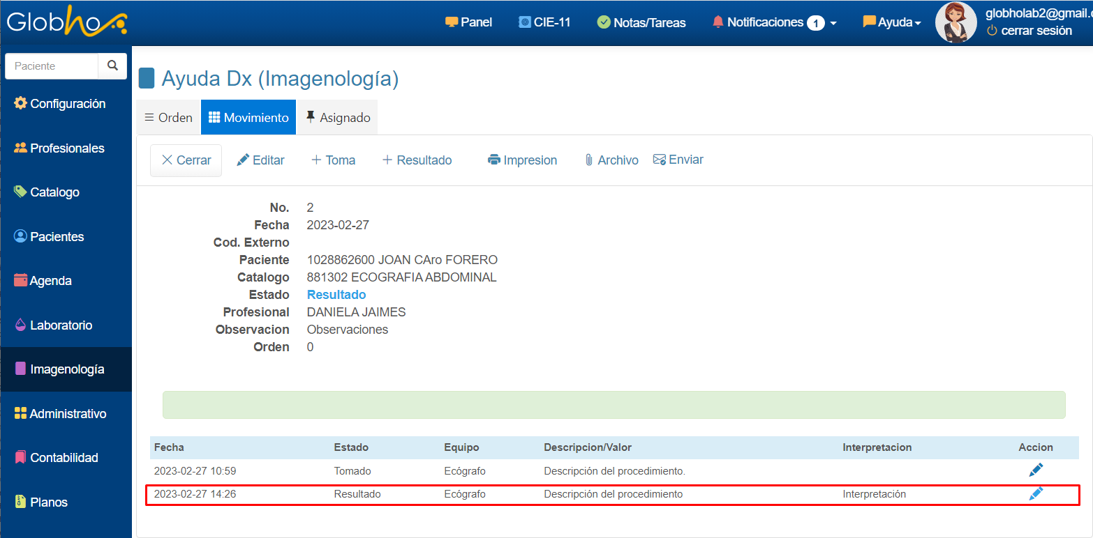 Crear resultado de procedimiento de Imagenología.