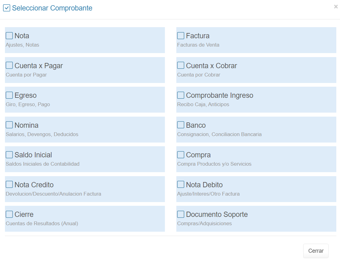2. En la sección Movimiento, haz clic en el botón + Crear Nuevo y selecciona el comprobante que desea generar.