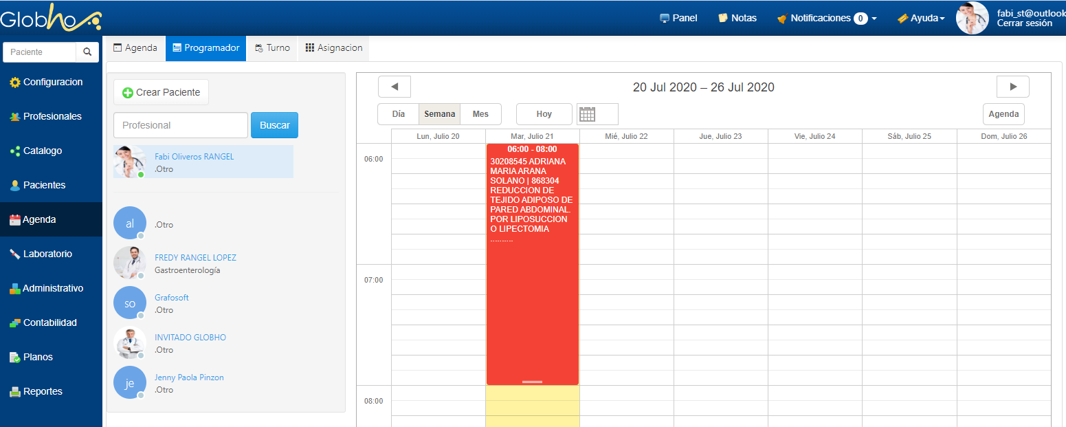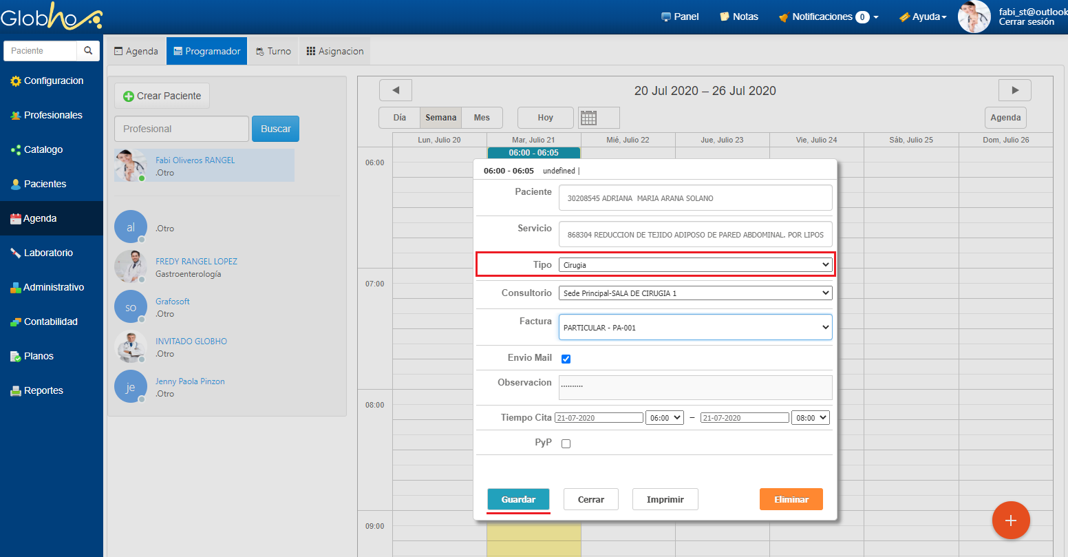 1. Selecciona Agenda en el Menú Principal y haz clic en Calendario/Programador y selecciona el Profesional al que vas a Agendar. 2. Ubicaté en la fecha y hora del calendario requeridos para la cita, y haz clic sostenido hacia abajo para establecer el tiempo de duración de la cita. 3. Diligencia el formato con los datos correspondientes y haz clic en el botón Guardar. Ten en cuenta que en el campo Tipo debes seleccionar la opción Cirugía.