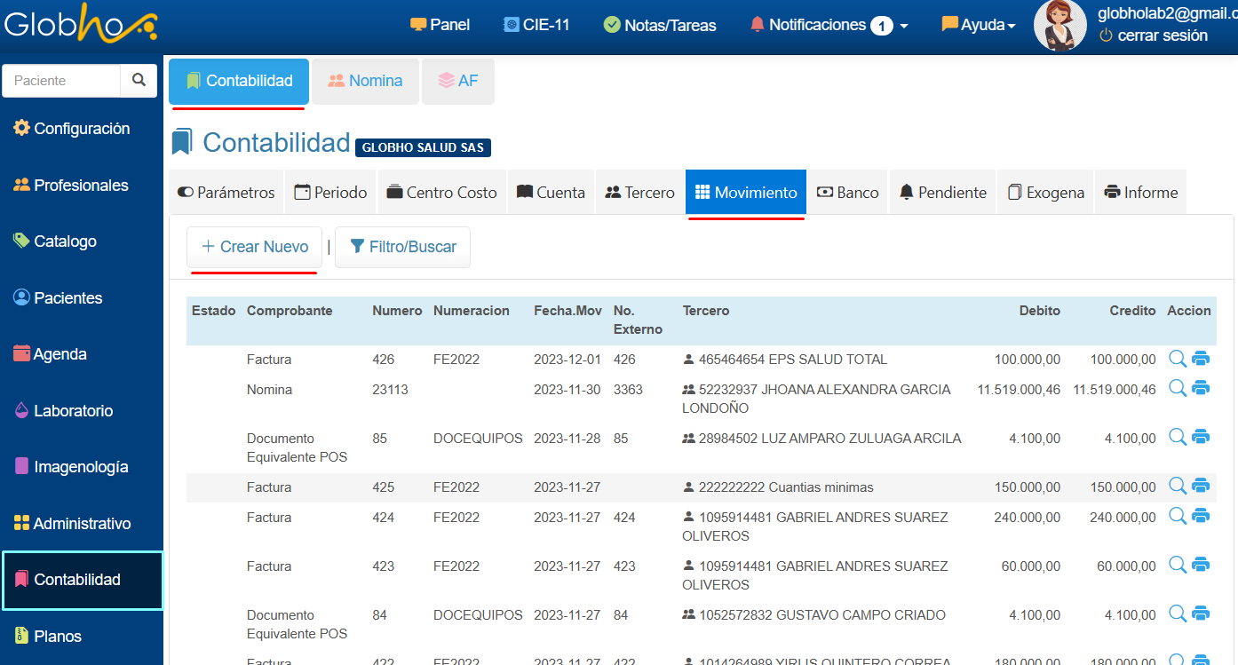 1. Realiza la ruta men煤 Contabilidad/Movimiento/Bot贸n Crear Nuevo.