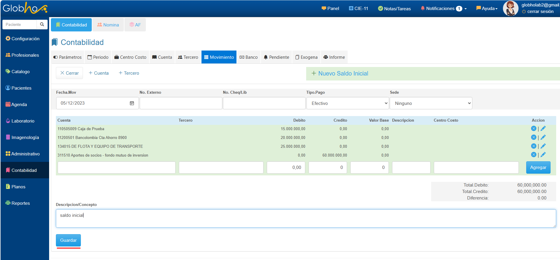 3. Agrega las cuentas y los valores correspondiente al debito o cr茅dito y haz clic en el bot贸n Guardar.