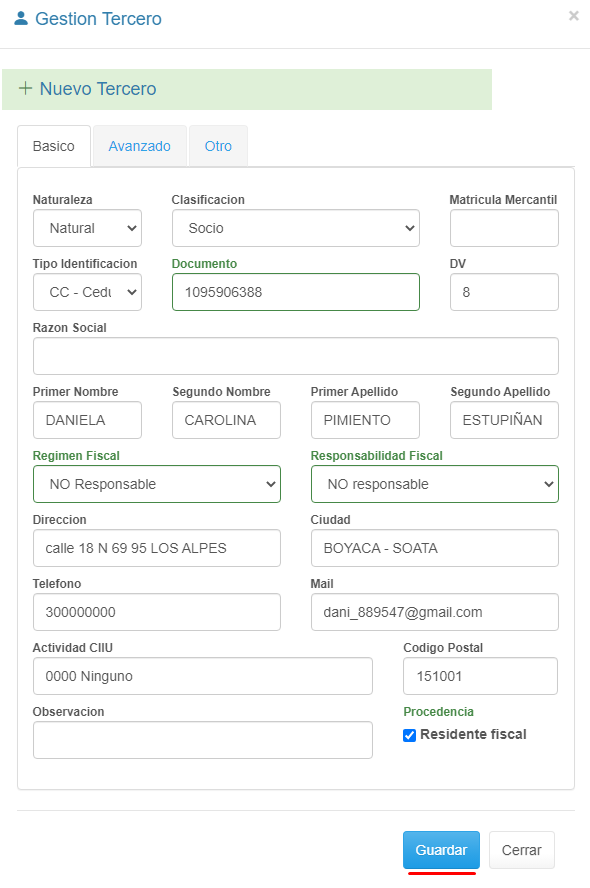 3. Diligencia los campos en las diferentes secciones del formulario y al finalizar haz clic en el bot贸n Guardar. Basico: Secci贸n para registro de Datos Generales del Tercero.