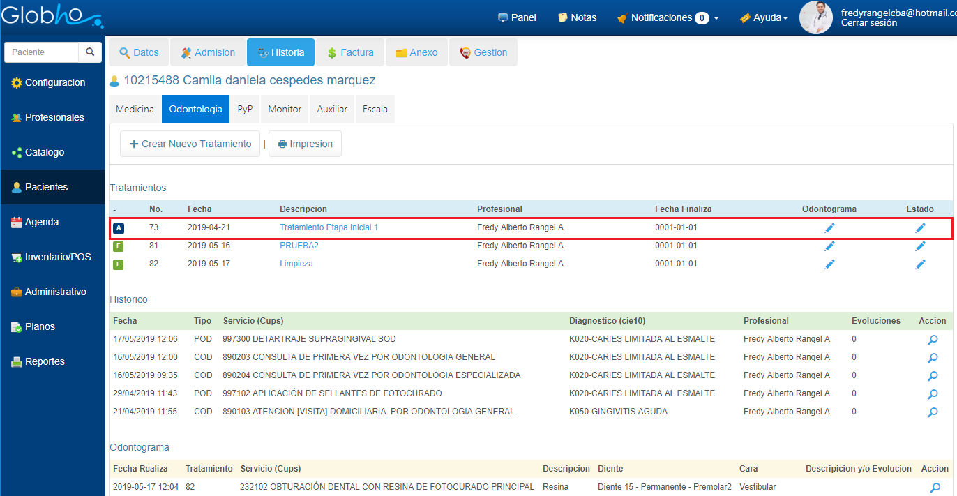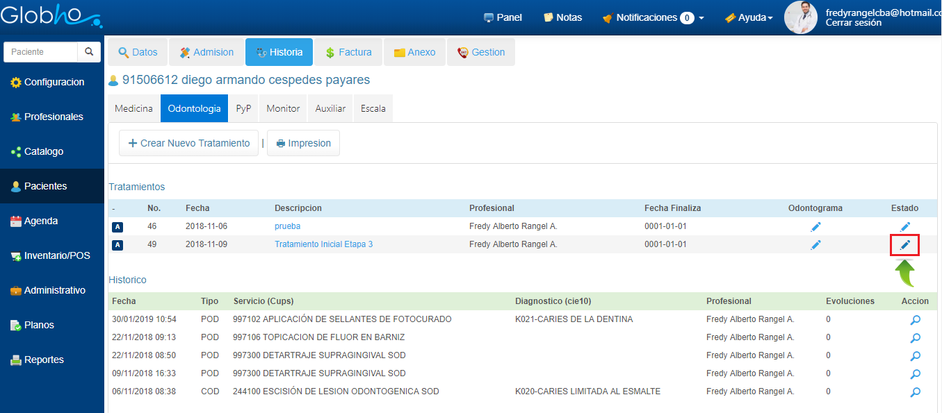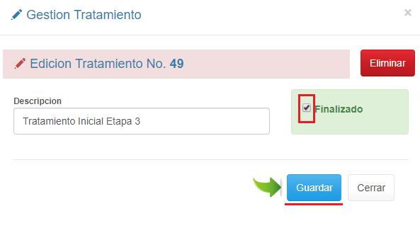 1. Selecciona el Paciente al que le vas a realizar la gestión. Ver aquí 2. Ingresa a Historía, elige la opción Odontología y haz clic en el icono en forma de Lápiz en la columna Estado correspondiente al Tratamiento que deseas Finalizar.