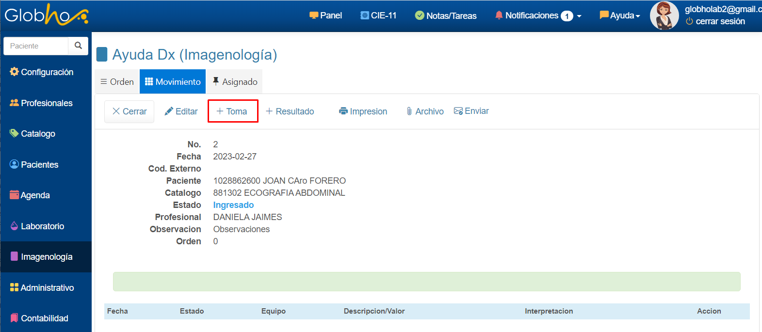 Crear toma de Pro. Imagenología