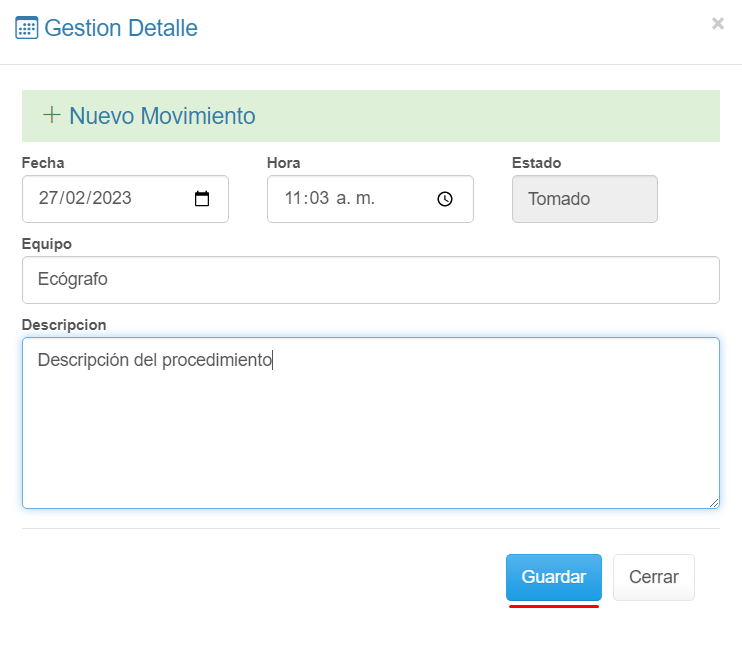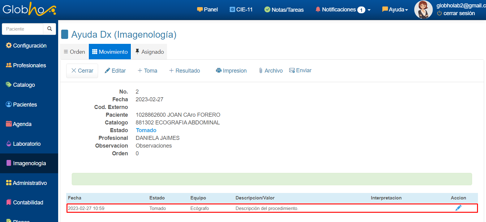 1. Realiza la ruta menú principal, Imagenología/movimiento, digita número de documento del paciente y haz clic en el botón Buscar.