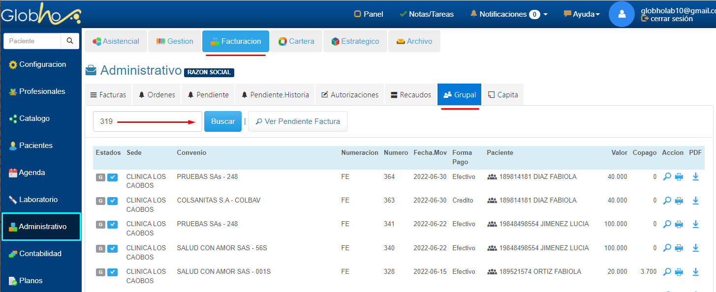 1. Ingresa a menú Administrativo - Facturación y digita en el campo de búsqueda el número de la Factura Grupal que deseas duplicar.
