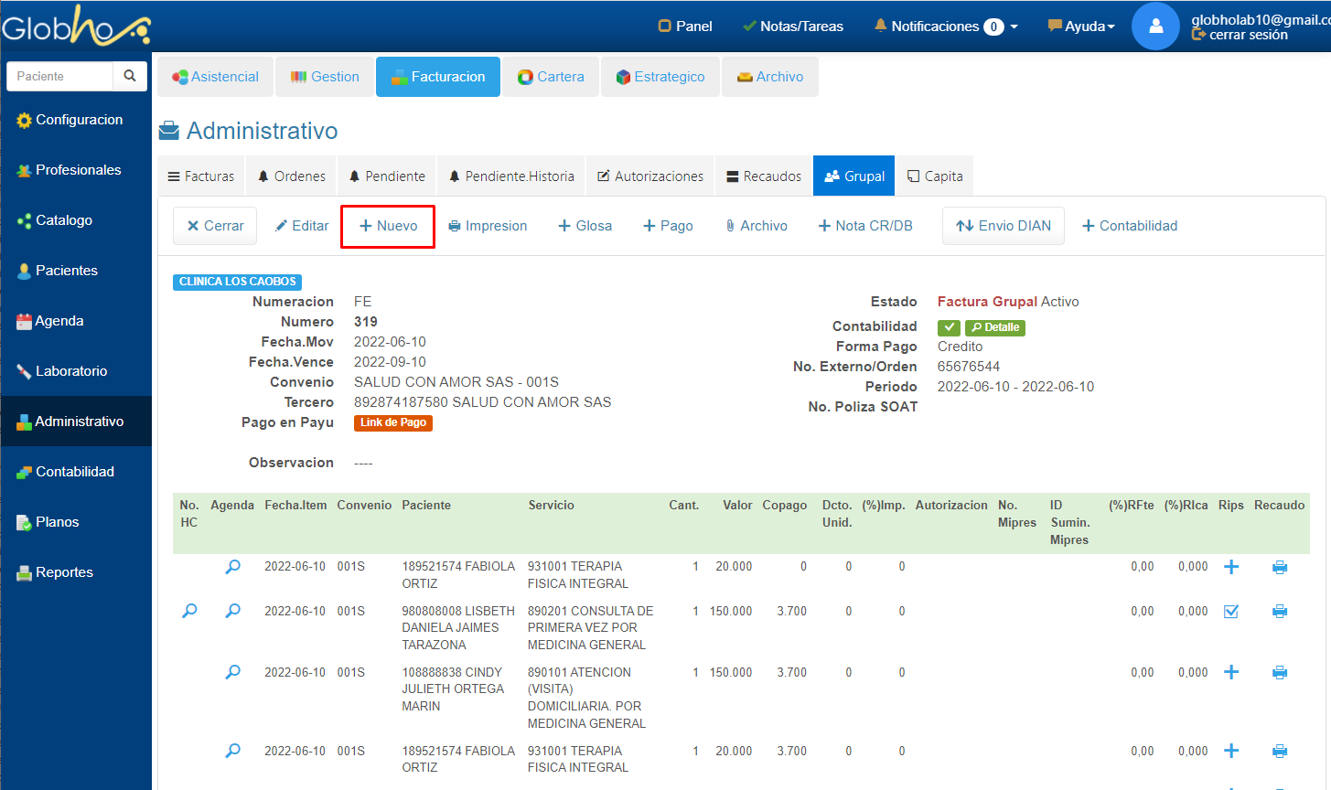 3. Desde el Detalle de la Factura Grupal haz clic en el botón + Nuevo.