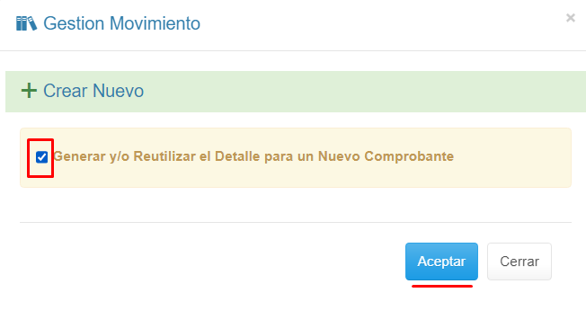4. Selecciona la casilla de verificación Generar y/o Reutilizar el Detalle para un Nuevo Comprobante.