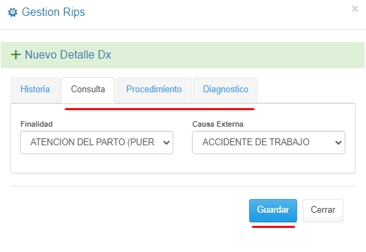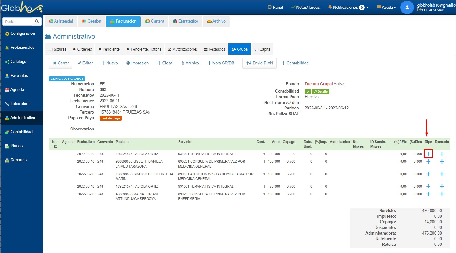1. En cada uno de los servicios Facturados, haz clic en el botón + ubicado en la columna Rips.