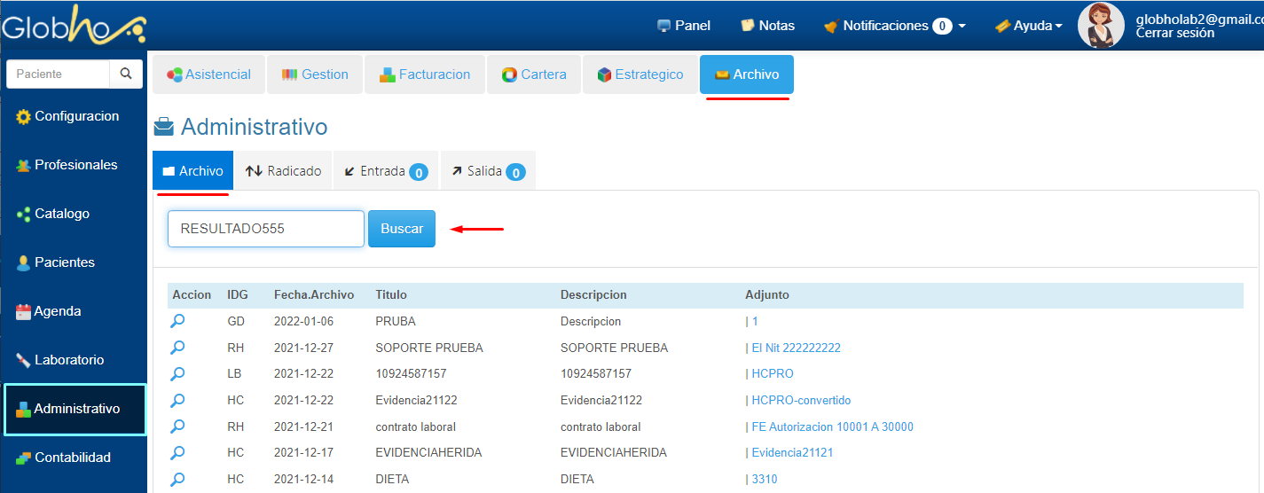 1. Ingresa a Menú Administrativo en el Menú Principal. 2. Realiza la ruta Archivo - Archivo e ingresa el nombre del Documento Adjunto en la barra de Búsqueda, haz clic en el botón Buscar.
