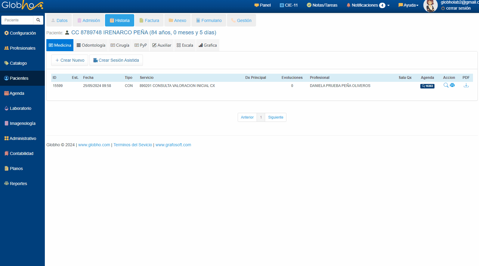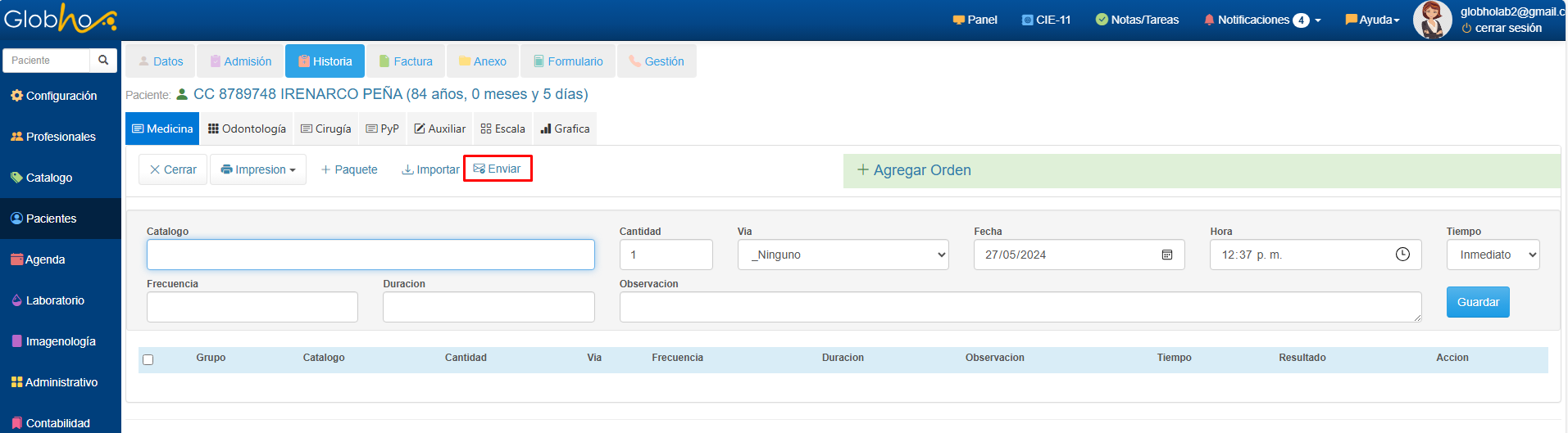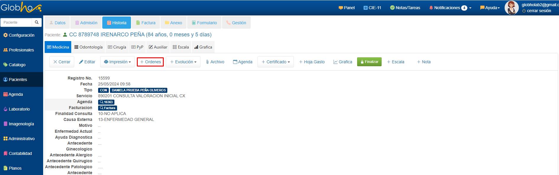 1. Desde el detalle de cada Historia Clínica Médica, Ver aquí haz clic en el botón + Ordenes.