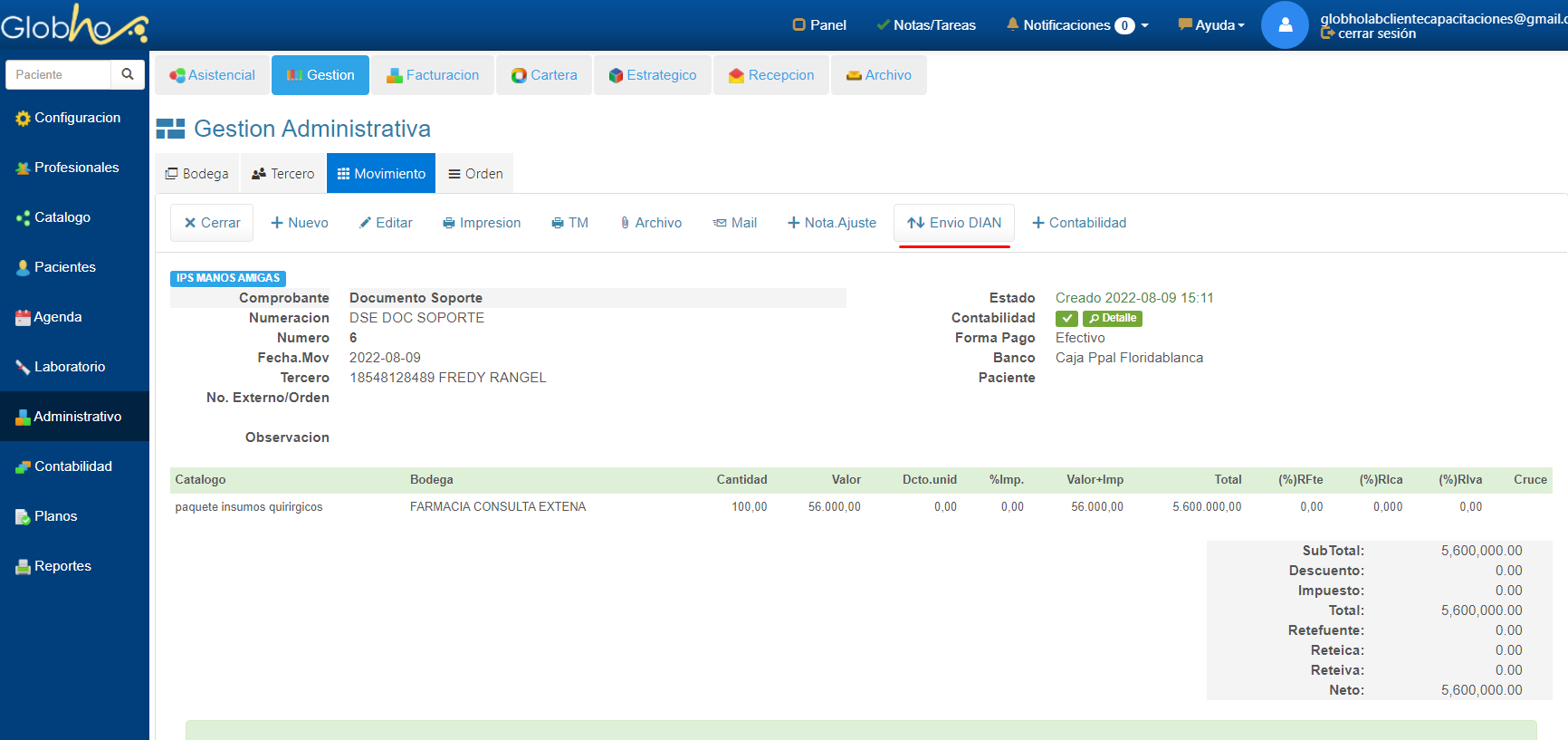 1. En el Detalle del Documento Soporte haz clic en el botón ENVIO DIAN
