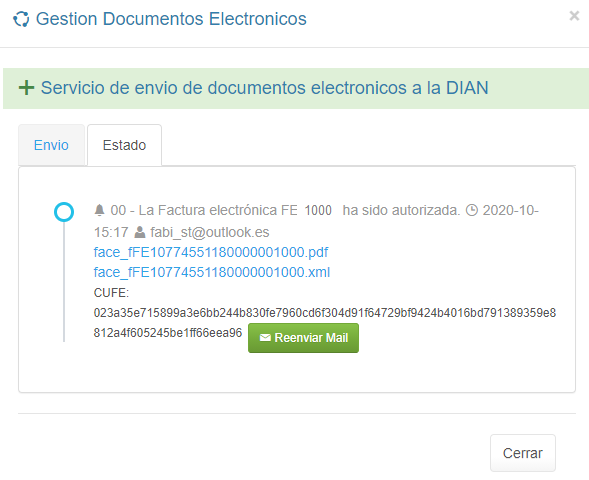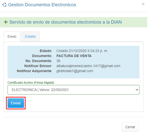 1. En el Detalle de la Factura haz clic en el botón ENVIO DIAN