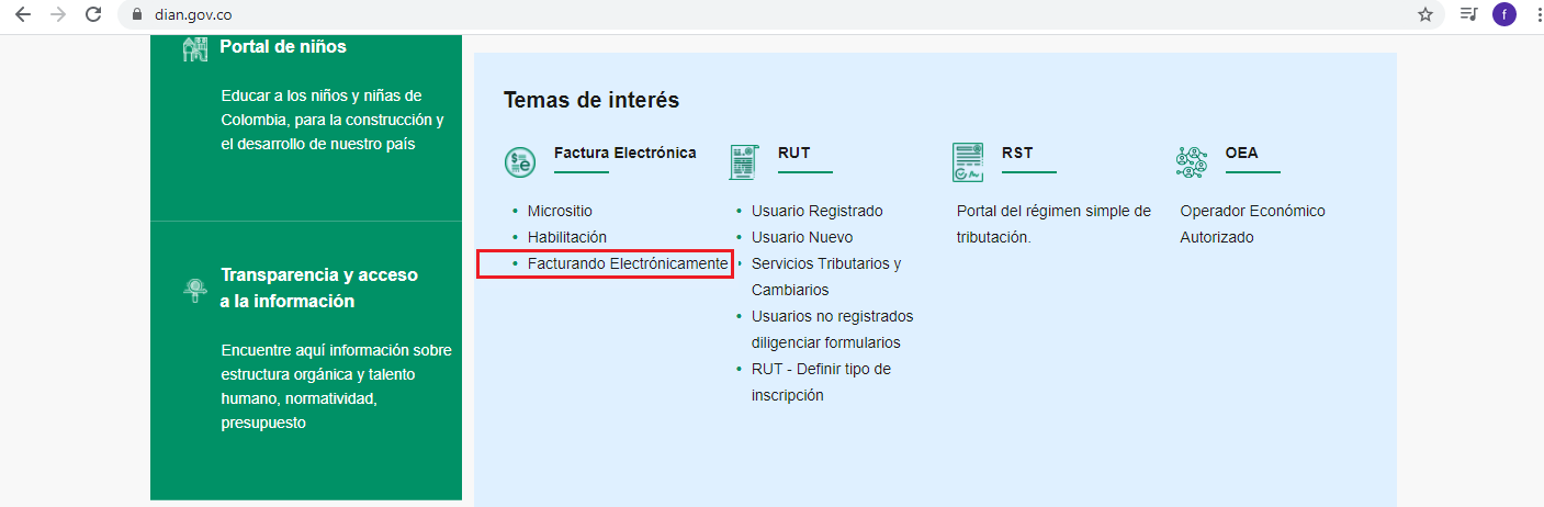 4. Ingresa a la página de la DIAN https://www.dian.gov.co y selecciona la opción Facturando Electrónicamente.