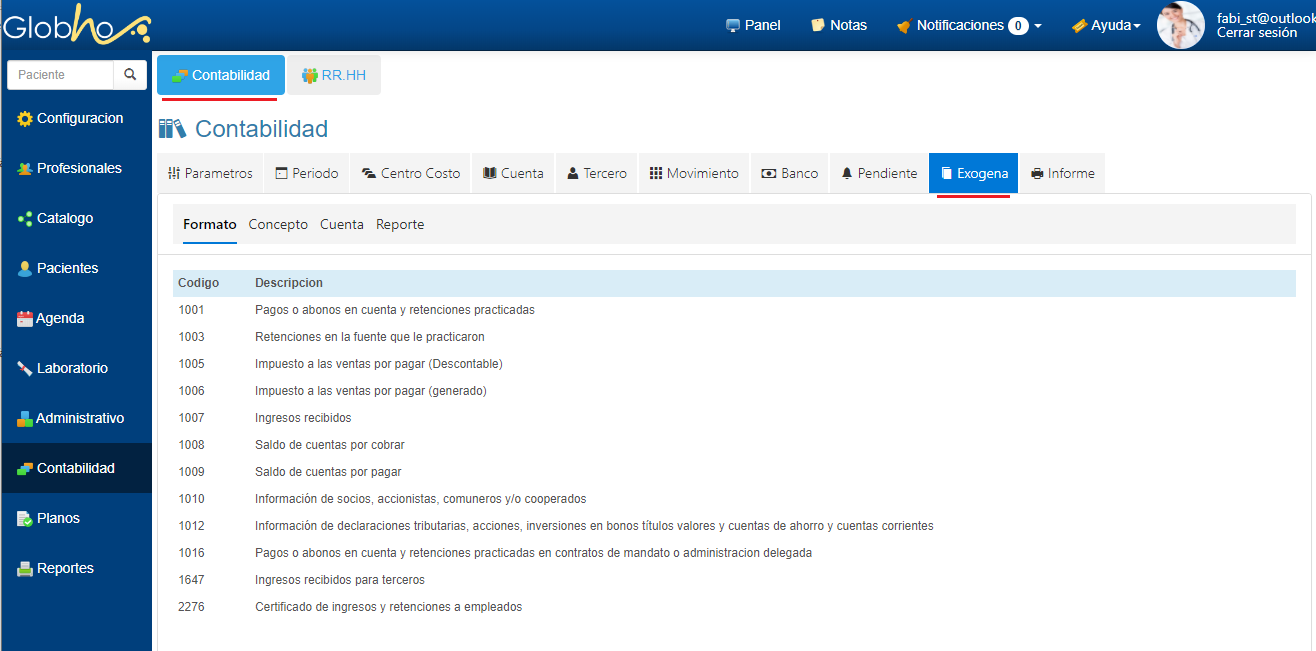 1. Haz clic en Menú Contabilidad y selecciona la pestaña Exógena. 2. En la sección Formato puedes visualizar los Formatos disponibles.