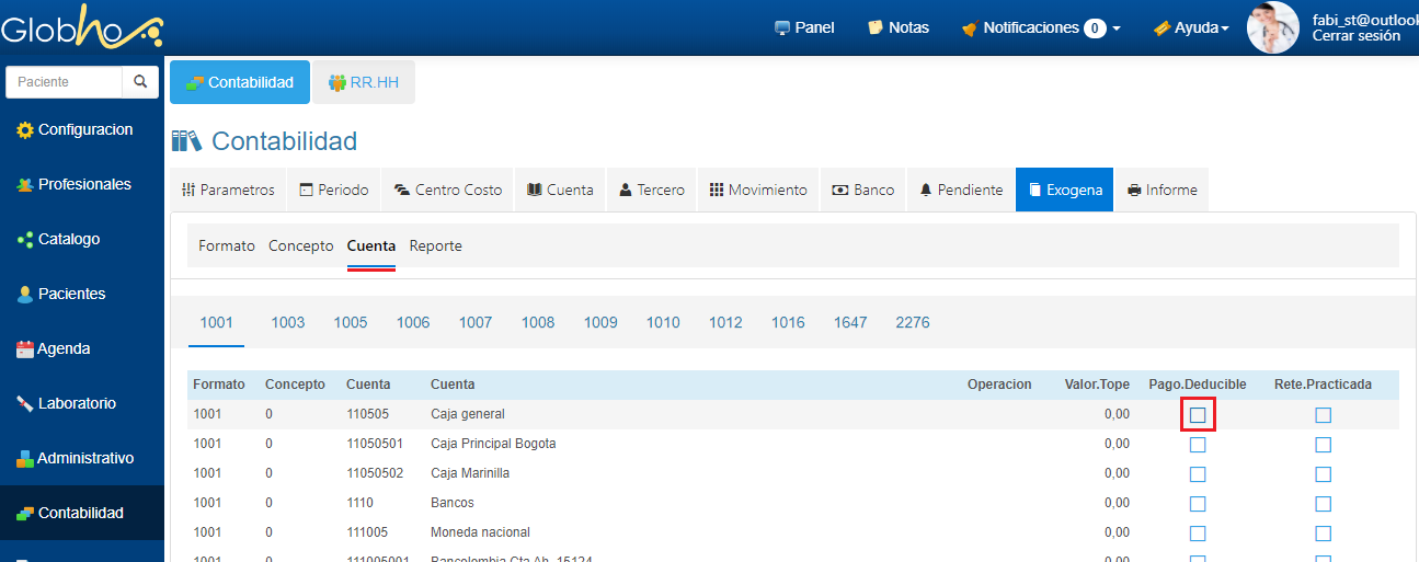 4. Haz clic Cuenta y selecciona el formato disponible para ingresar los parámetros de las columnas Ingreso.Bruto e Ingreso.Tercero, haciendo clic sobre la casilla de verificación correspondiente. Ejemplo: