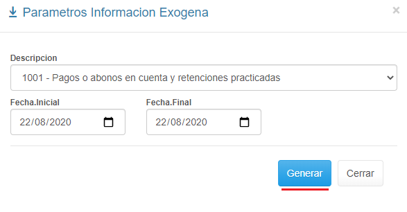 7. Elige el Formato del informe que deseas generar en el menú desplegable Descripción y específica el Rango de Fechas del Periodo a Informar.