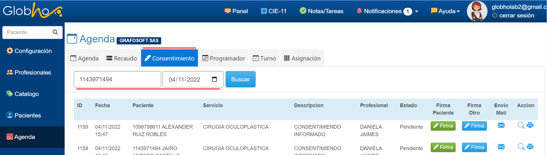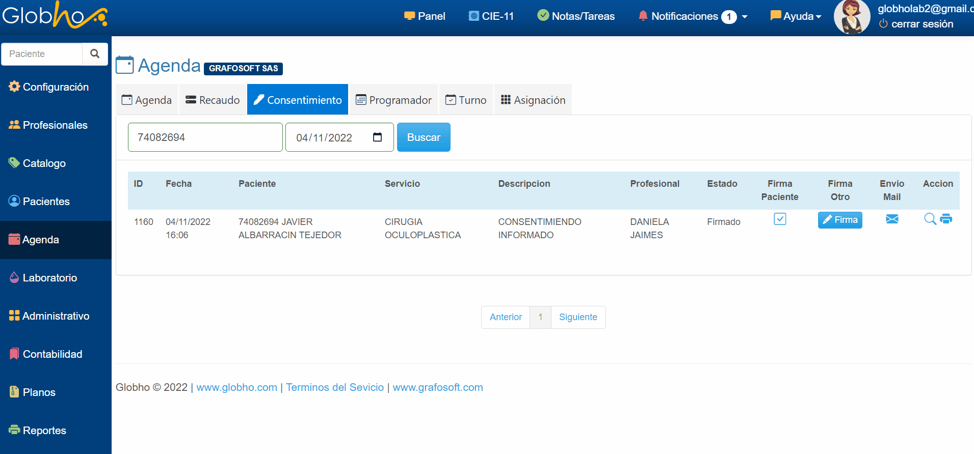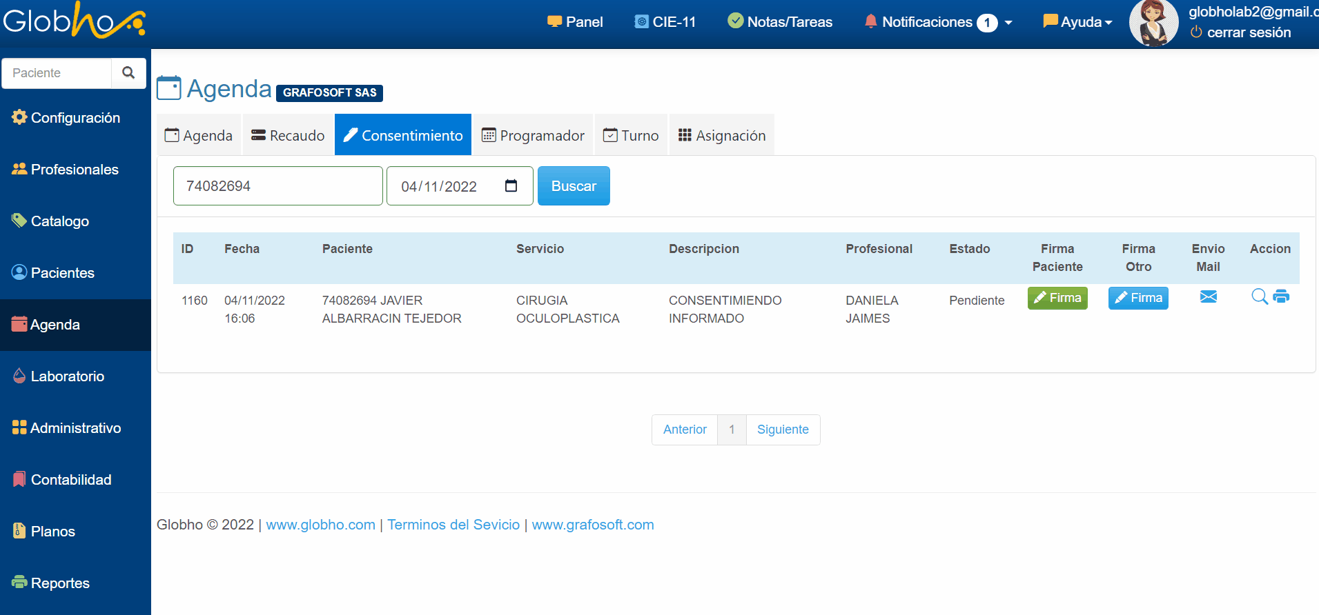 Ten en cuenta crear el consentimiento informado con el fin de que se visualice en este apartado. Ver aquí ☑ Globho te permite enviar el consentimiento Informado al correo del paciente con el fin de que sea firmado desde el correo electrónico ó luego de haberlo firmado en caso de realizar el proceso directamente en la IPS. |