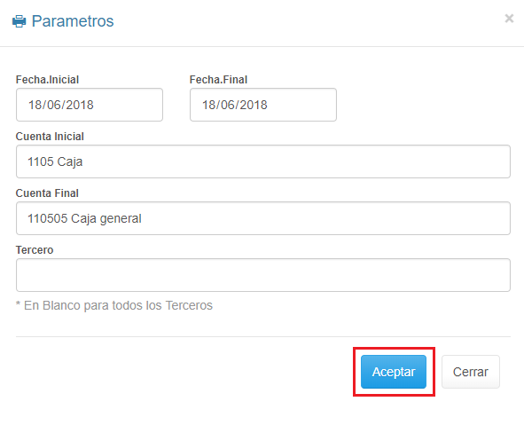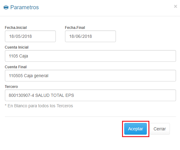 2. Digita los Parámetros requeridos por el formulario. * Para generar el informe de una sola cuenta, la Cuenta Inicial debe ser igual a la Cuenta Final.
