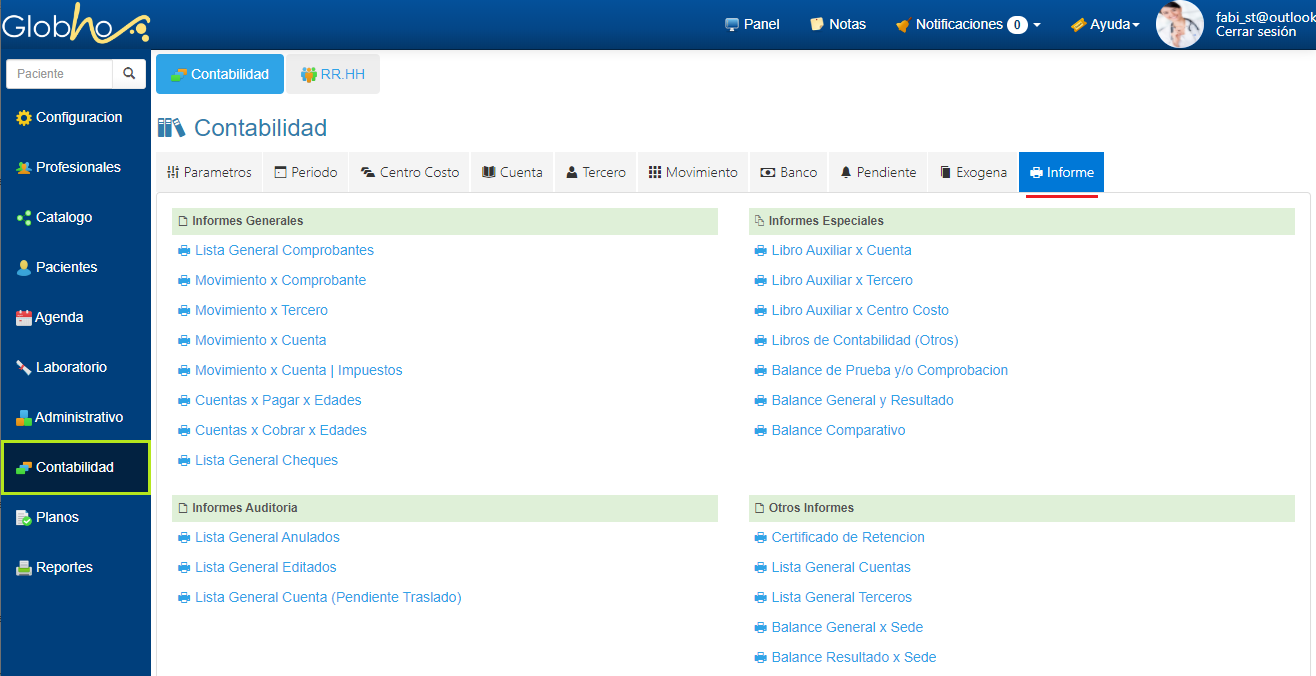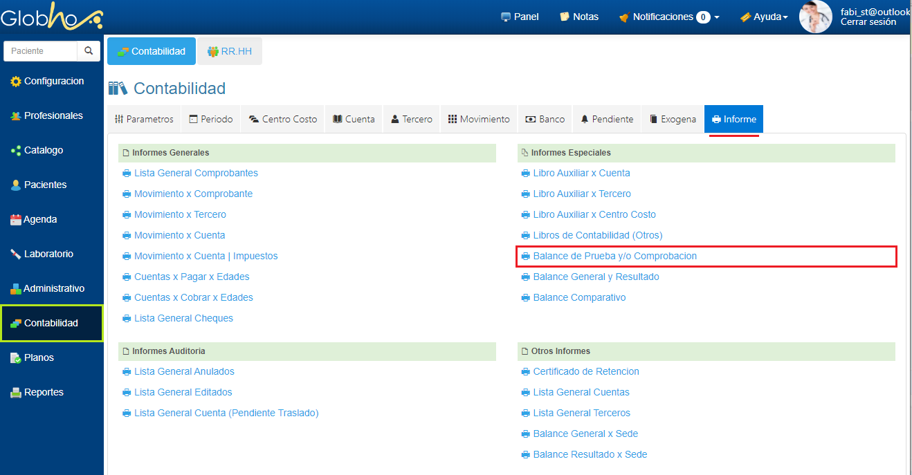 1. Haz clic en Menú Contabilidad y haz clic en la pestaña Informe.