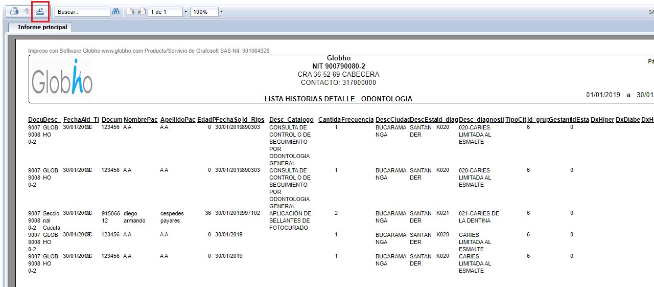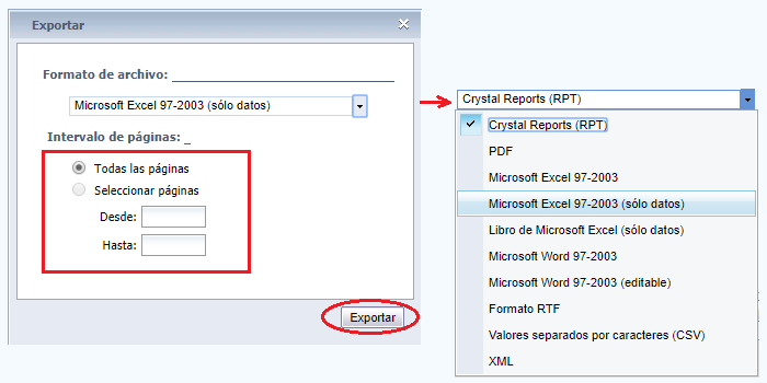 5. Selecciona el formato al que deseas Exportar el Informe y parametriza el Intervalo de las páginas. Para finalizar hacemos clic en el botón Exportar. *Para este caso, seleccionamos Microsoft Excel 97-2003(sólo datos) y Todas las páginas.