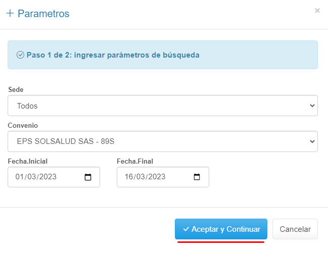 2. Diligencia los Parámetros a consultar y haz clic en el botón Aceptar y Continuar.