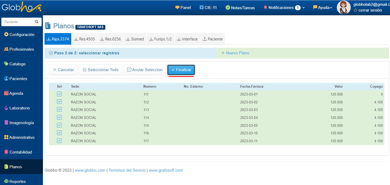 3. El sistema filtrará todas Facturas generadas en el periodo consultado, si deseas discriminar algunas puedes hacer la selección uno a uno realizando un clic dentro del cuadro de verificación ubicado al inicio de cada registro. Para continuar haz clic en el botón Finalizar.