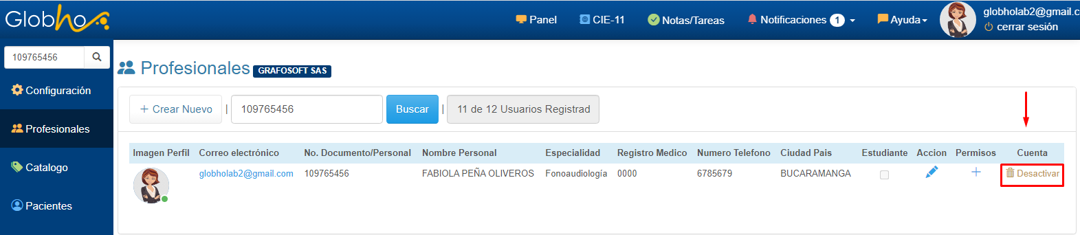 1. Ingresa a Profesionales en el Menú Principal. 2. Ingresa Nombre o número de Identificación del Profesional y haz clic botón Buscar ó presiona la tecla Enter.