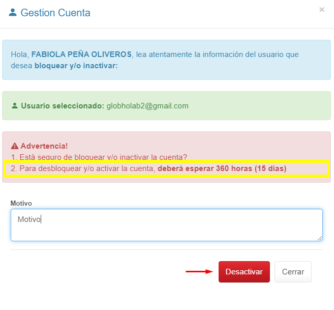 4. Digita un motivo para la desactivación y haz clic sobre el botón Desactivar.