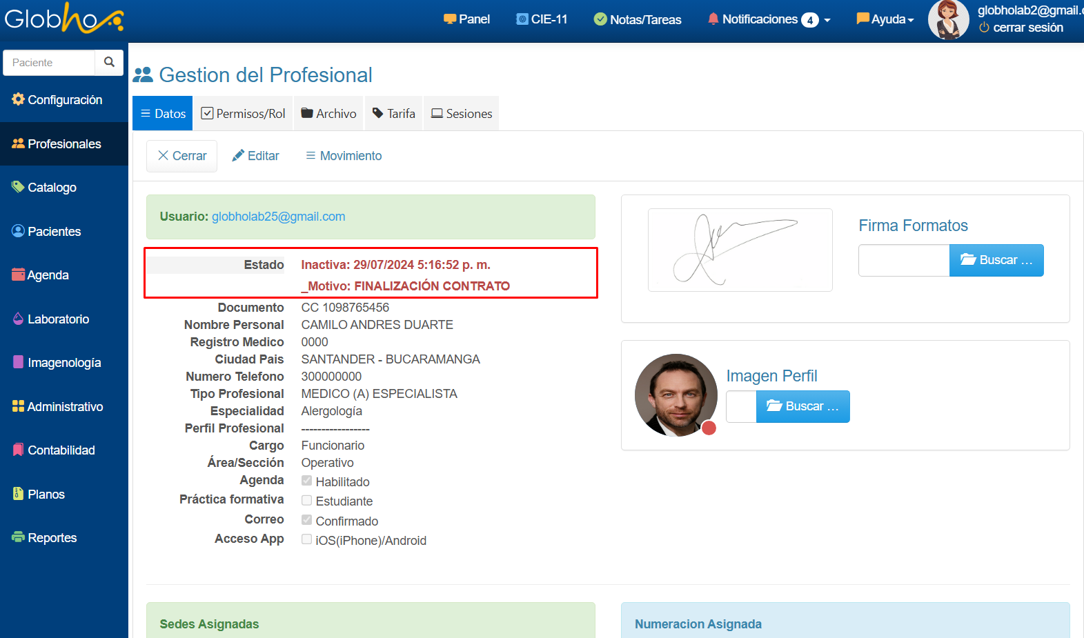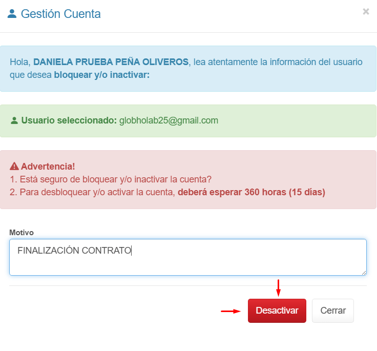 El nuevo estado del usuario se mostrará en la descripción Inativo junto con la fecha y hora a partir de las cuales iniciarán las 360 horas sin posibilidad de activar nuevamente el usuario.