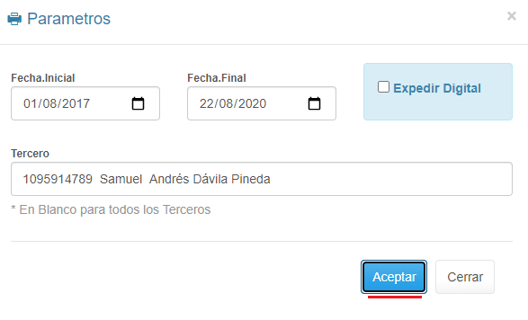 4. Diligencia el formulario, digitando el rango de fechas requerido y omitiendo el campo Tercero, para finalizar haz clic en el botón Aceptar.